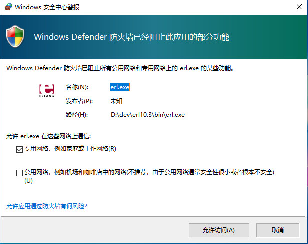 中间出现防火墙拦截警告,勾选我的网络状况,选择“允许访问(A)”即可。